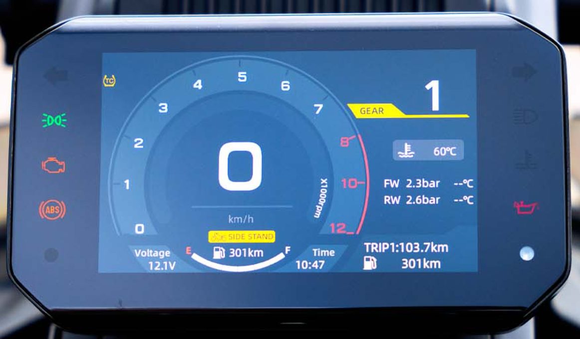 The 700MT is loaded with features to elevate every ride, from cold mornings to unpredictable terrain. Heated grips and rider seat come standard, along with tyre pressure monitoring, USB charging ports, handguards, a bash plate, and adjustable levers. The 700MT also features switchable ABS and traction control for tailored performance across varied conditions.
