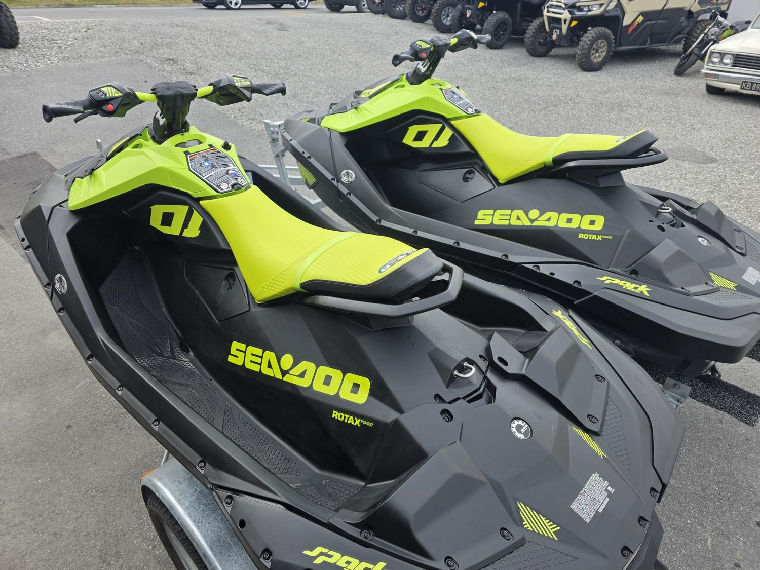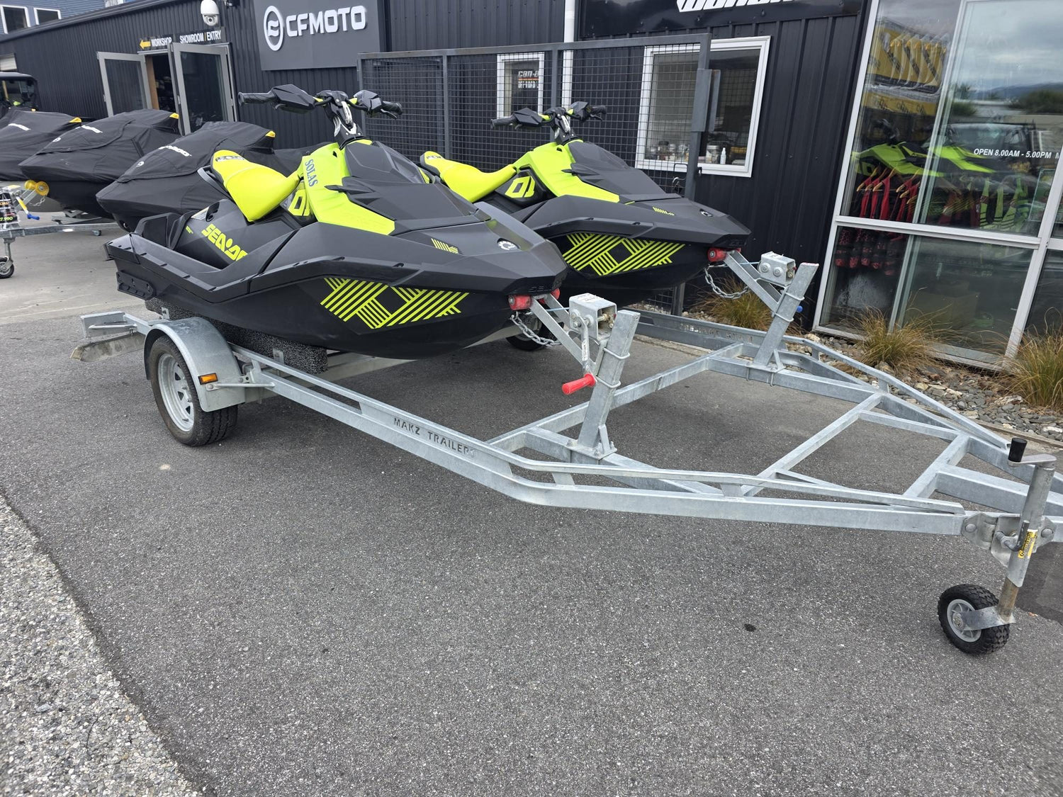 Late model Spark Trixx 2Up skis with super extended iBR for ultimate playtime fun, these skis come with Front Storage Lockers and Road Covers on a Makz 13 inch Galv Wheel Trailer ready to ride.